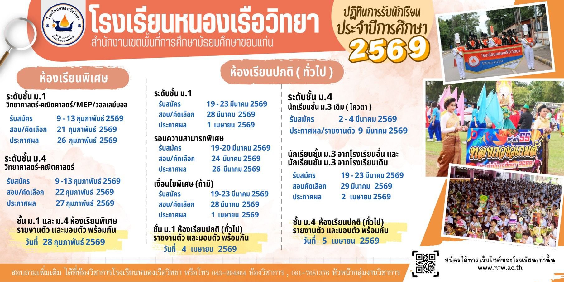 หมวดหมู่ ข่าว 76 คำสั่ง 1 ประกาศ 2 ประชาสัมพันธ์ 1 เรื่องล่าสุด มอบเอกสารการจบหลักสูตร ม.3 และ ม.6 20 กุมภาพันธ์ 2026 เปิดบ้านวิชาการหนองเรือวิทยา 13 กุมภาพันธ์ 2026 มอบรางวัลกิจกรรม NRW Cup 11 กุมภาพันธ์ 2026 การนิเทศบูรณาการโดยใช้พื้นที่เป็นฐาน (Area-Based) 10 กุมภาพันธ์ 2026 ประกาศรับสมัครนักเรียน ปีการศึกษา 2569